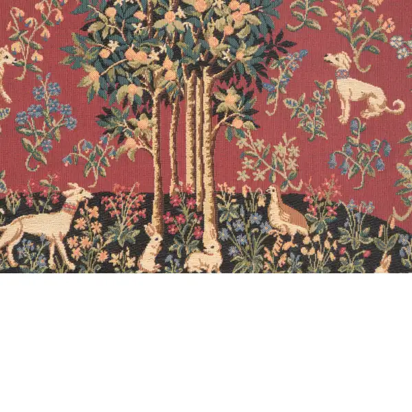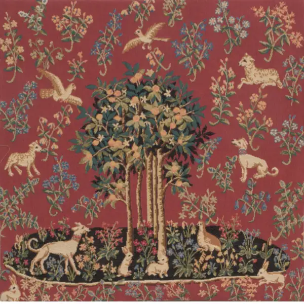 We see the scene of a blossoming orange tree with rabbits playing closeby. The orange tree is a symbol of celebration and marriage in many cultures. Here we see the medieval motif of a thousand flower or mille fleur background, made so popular in the Middle Ages. Two bunnies are on the forest floor enjoying the rich foliage, accompanied by the other forest critters all around, and this is echoed by the abundance of flowers in the red background.
