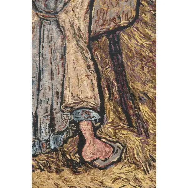 Van Gogh's Flax harvest tapestry depicts a scene of a blond lady worker harvesting flax in a barn.
