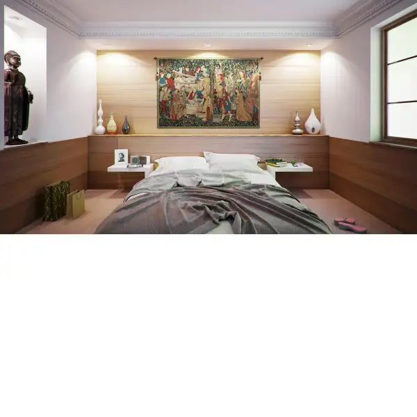 The original tapestry was woven in Tournai in the 15th century. This is a remarkable representation of the grape gathering and the wine press on a 'Mille Fleurs' background. The original is exposed at the Cluny Museum in Paris, France.