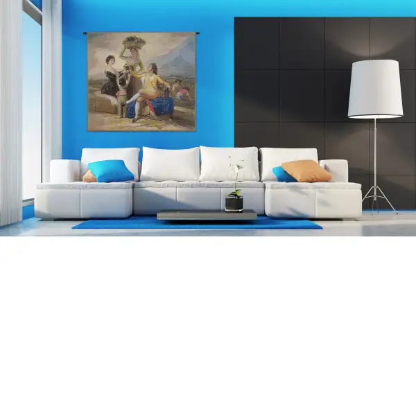 This Belgian wall tapestry, Vendimia, or The Wine Harvest, is a reproduction of a painting by Francisco Goya, a Spanish romantic painter, in 1786. Lively shades and their contrast forming a harmonic whole, show us the artist´s true maturity. Scenes from everyday life at the time is the main motif in a series of paintings Goya did between 1786 and 1788.