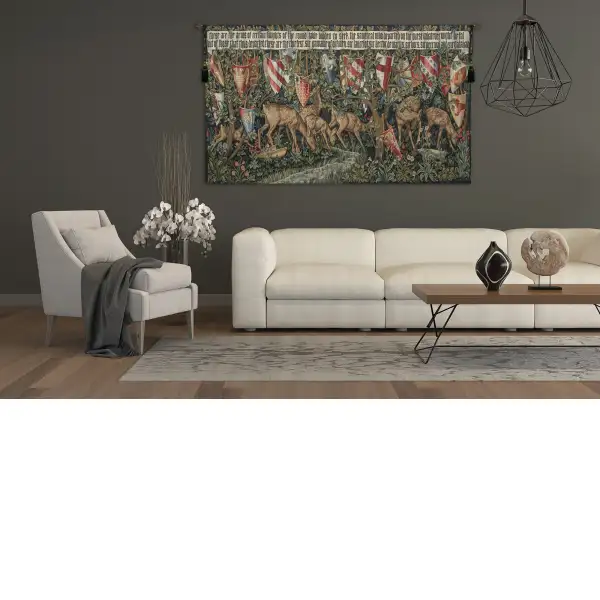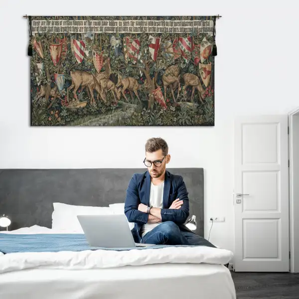Verdure with Reindeer is a European jacquard wall tapestry. The original tapestry was designed by Edward Burne Jones and woven by Morris & Co. It is one of the six panels illustrating the story of the Quest for the Holy Grail. this piece represents the arms of the Knights of the Round Table: Sir Gawaine, Lancelot, Hector, Perceval, Bors and Galahad among others.