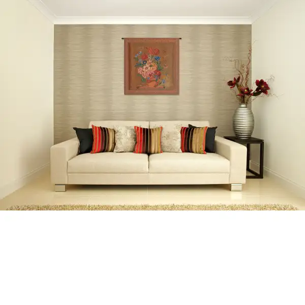 Bouquet de Verendael Belgian tapestry is a 17th Century motionless life piece featuring a vase full of flowers inspired by the painter Nicolaes Van Verendael set with a gold background.