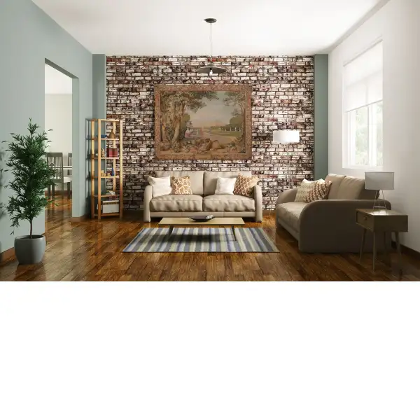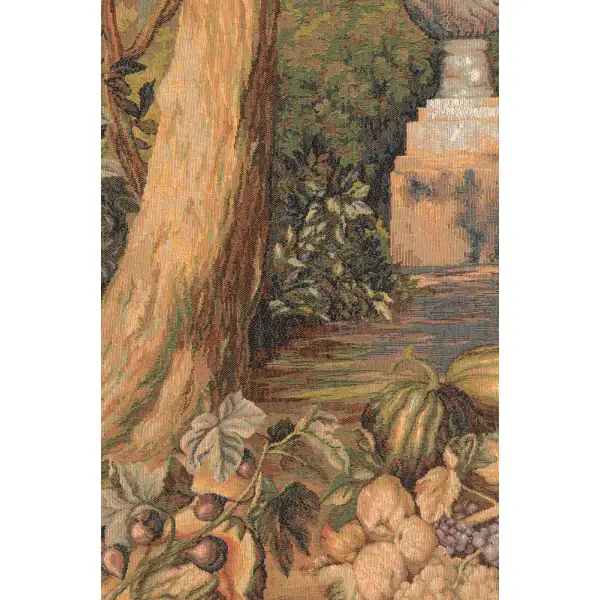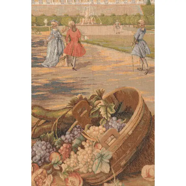 Versailles III is a jacquard wall art tapestry. it's foreground is a reproduction of a renowned Gobelins' tapestry, L'automne, or Autumn, by Charles Le Brun and now part of France's Mobiler National collection. The central theme is the Versailles gardens and water works; all surrounded by an intricate floral border.