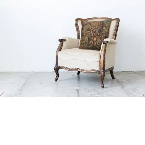 Vieux Brussels II Belgian tapestry cushion cover depicts one of twelve hunting scenes in the Maximillian series woven in the late 16th century for the Archduke Maximillian who was later to become Emperor. The central ram of Aries signifies the month of March and the central horseman is the Emperor Charles V.
