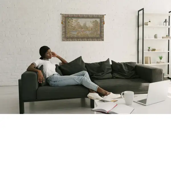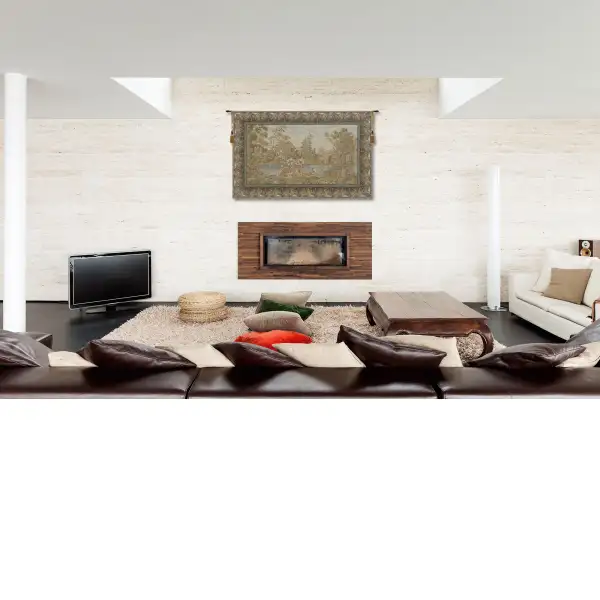 Washing Day at the Mill, Horizontal is an Italian jacquard woven wall tapestry. This tapestry is a rendering of one of a series painted by Francois Boucher (1703-1770), and shows women washing clothes by a lake, a typical pastoral activity that was popular in the Rococo era. Boucher was a French painter in the Rococo style, known for his idyllic and voluptuous paintings on classical themes, decorative allegories, and pastoral scenes. He was perhaps the most celebrated painter and decorative artist of the 18th century. He also painted several portraits of his patroness, Madame de Pompadour.