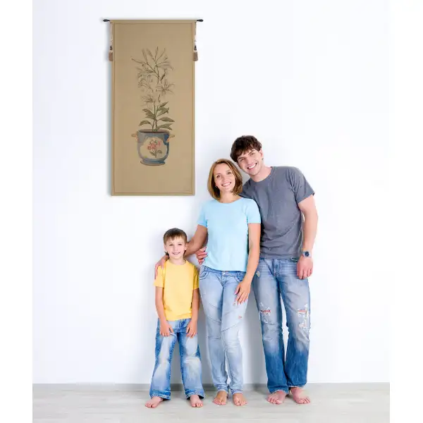 At once exotic and alluring, the White Amaryllis Large Tapestry by French artist Fabrice de Villeneuve brings the beauty of botanical artistry to the home or office. This large woven tapestry will look wonderful hanging in the living room or bedroom with other light-colored furnishings and gold and green accents. This piece features an elegant floral silhouette potted in a decorative French bowl with delicate paintings set against a faintly patterned background. The narrow, tall tapestry will look lovely gracing the wall in between two windows or in a narrow niche. The tapestry is made of cotton, viscose, and polyamide for a lovely hand and textural sheen. Backed with lining and tunnel for easy hanging.