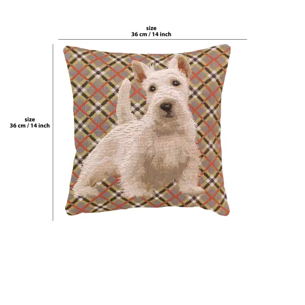 Imported jacquard woven tapestry cushion cover of precious Scottie Dog over a traditional plaid backdrop adds a certain special charm to your home decor motif.