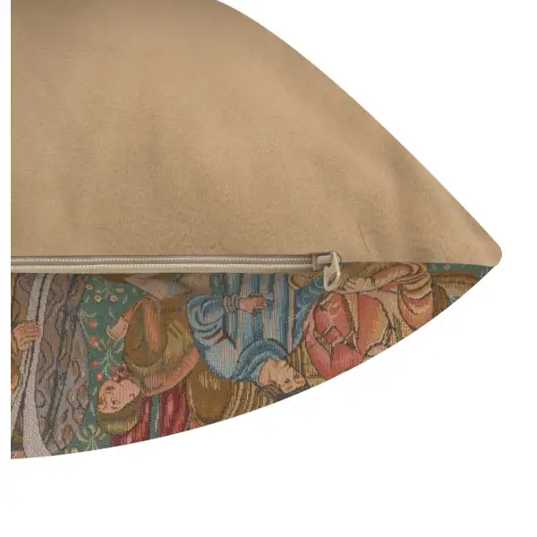 Wine Making is a fine art European jacquard woven tapestry cushion cover. It is an extract of Marche au vin, or Winemarket, which was woven in the 15th century in Flanders. The scene depicts trading in the wine market. Companion piece to this is #877 Wine Making.