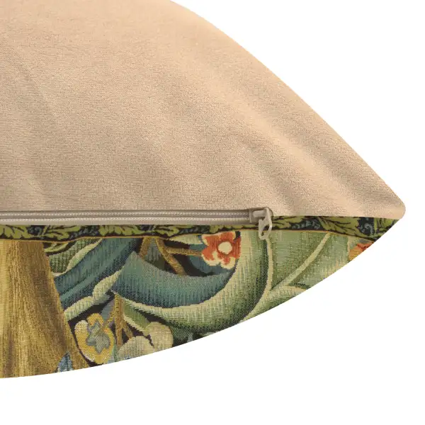 The Woodpecker Left by William Morris brings the beauty of nature to life with its woven texture and resplendent color. Tuck a pair of these lovely cushion covers over your favorite pillow forms and toss onto the sofa or bed for a colorful touch. The period inspired tapestry design depicts a woodpecker perched on a tree set against a background of wild bushes and greenery. Morris founded the British arts and crafts movement during the late 1800s. Cushion cover backed with lining and zipper. Infill not included. Woven in France.